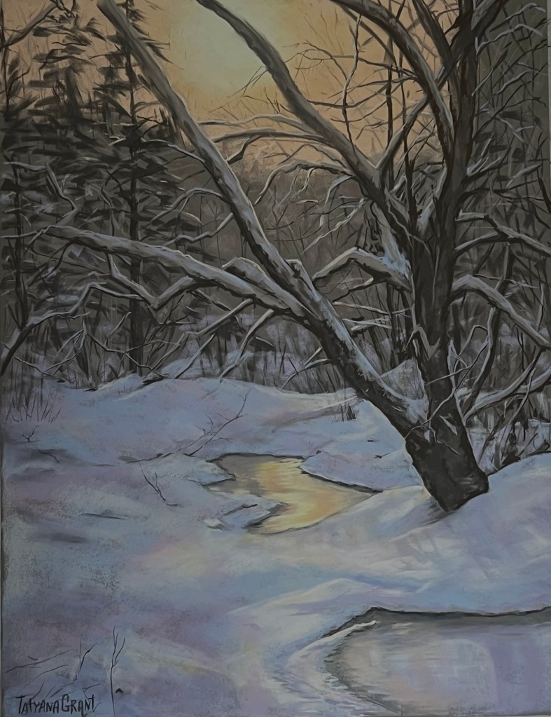 Painting done in the pastel medium on the velvet archival paper is 27 by 27 inches.